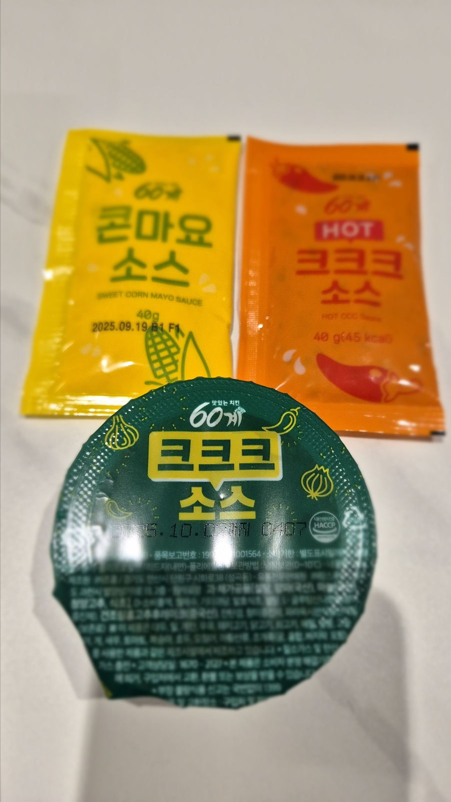 크크크치킨의 또 다른 핵심 매력은 바로 함께 오는 3가지 소스입니다! 저희가 받은 건 콘마요 소스, 크크크 소스, 핫크크크 소스였는데요. 이 소스들을 어떻게 조합하느냐에 따라 크크크치킨의 맛이 완전히 달라지는 '먹는 재미'가 있었습니다.