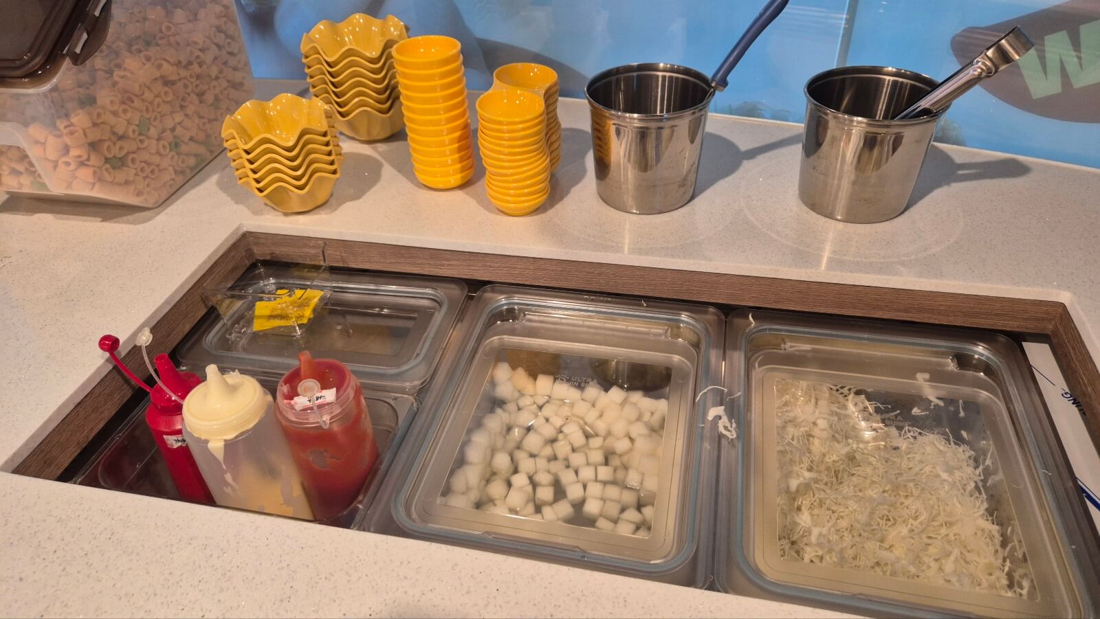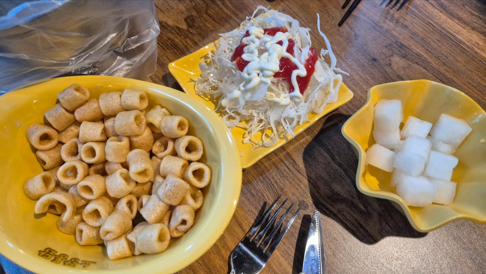 테이블마다 키오스크가 설치되어 있어 편리하게 주문을 마쳤습니다. 저희 가족의 선택은 노랑3종치킨(순살)과 감자튀김. 잠시 후 마카로니 과자와 옛날 스타일의 양배추 샐러드가 기본으로 차려집니다. 부족한 반찬은 셀프바에서 편하게 가져올 수 있어 좋았습니다.